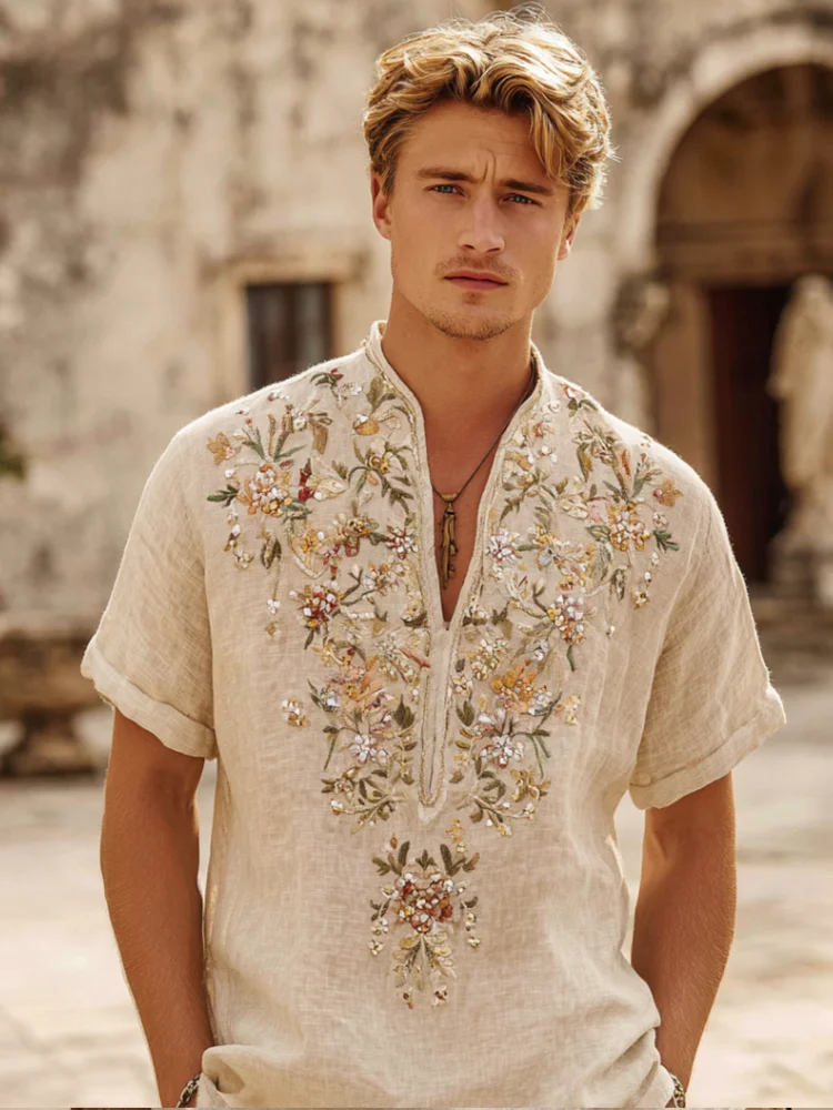 Bohemian Style Embroidered Flower Sequin Vintage Linen Men's V-neck Short-sleeved Shirt