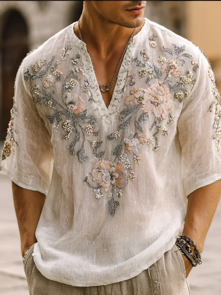 Bohemian Style Three-dimensional Embroidered Flowers, Vintage Linen, Lonesome White Men's V-neck Short-sleeved Shirt
