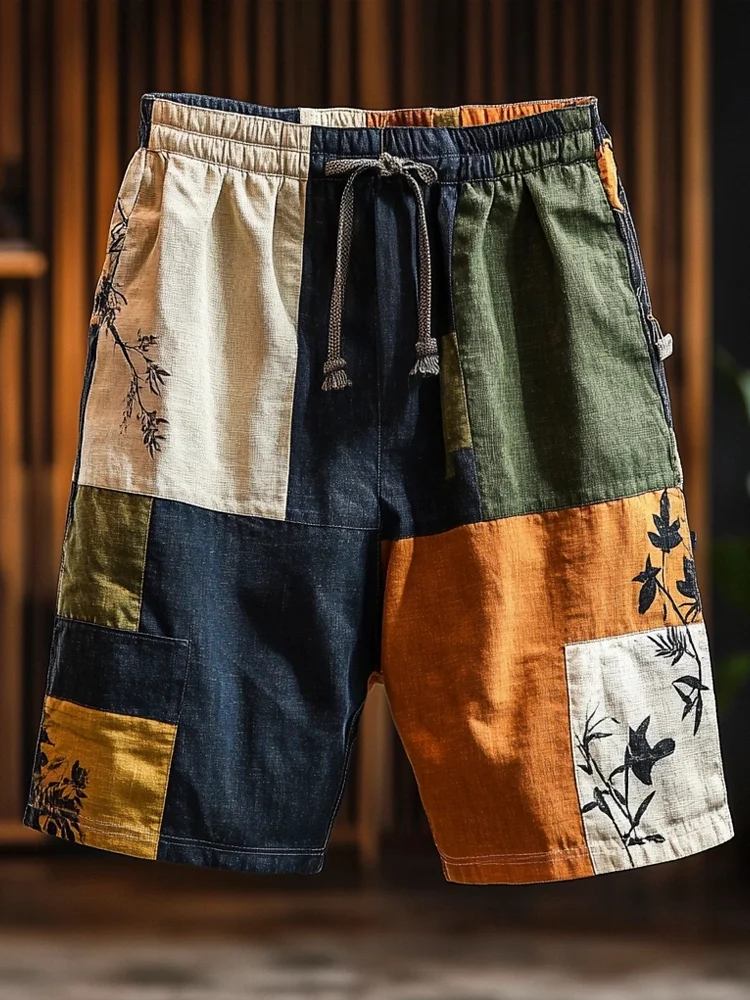 Boho Art Patchwork Fabric Men's Vintage Linen Short