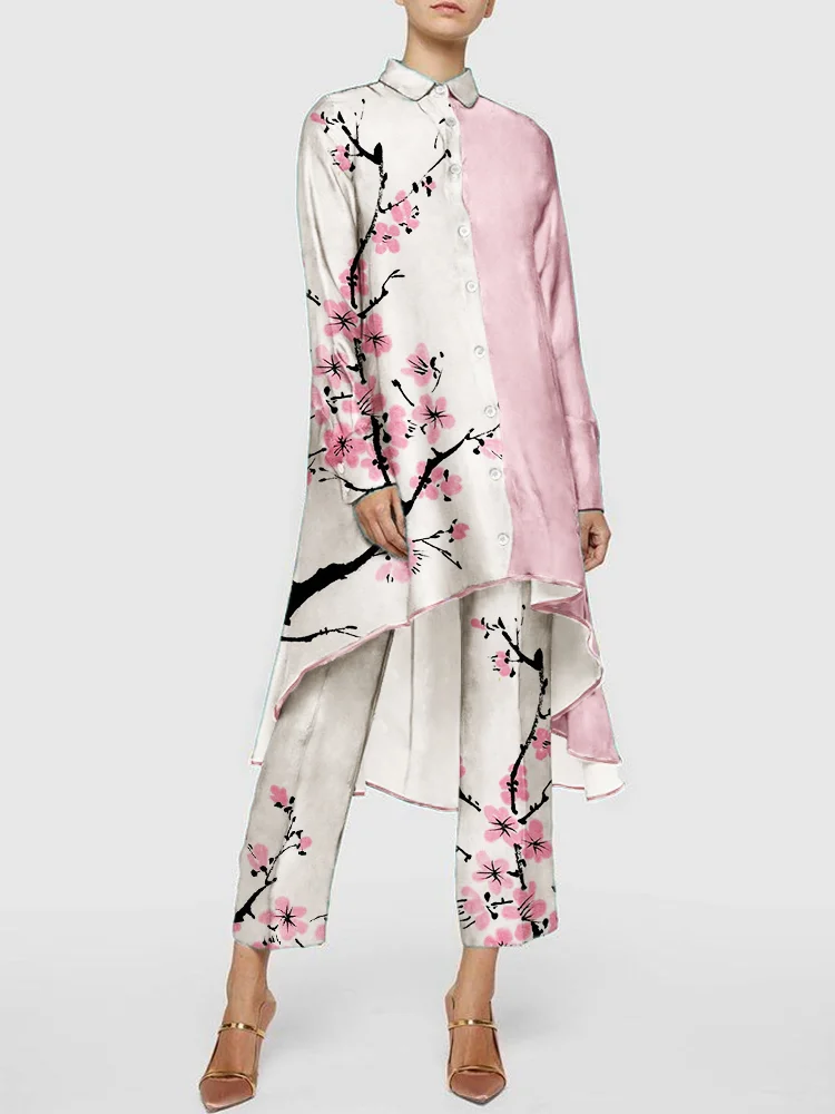 Cherry Blossom Ink Art Contrast Flowy Blouse & Pants Set