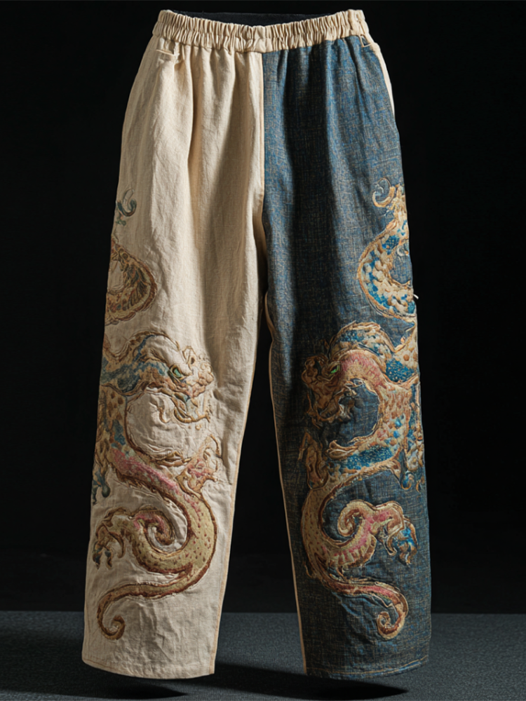 Dragon Embroidery Pattern Double-color Men's Casual Retro Cotton And Linen Wide-leg Pants