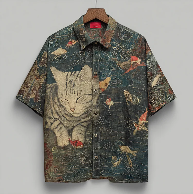 Japanese Art Style Fun Cat Elements Men's Short Sleeve Shirt