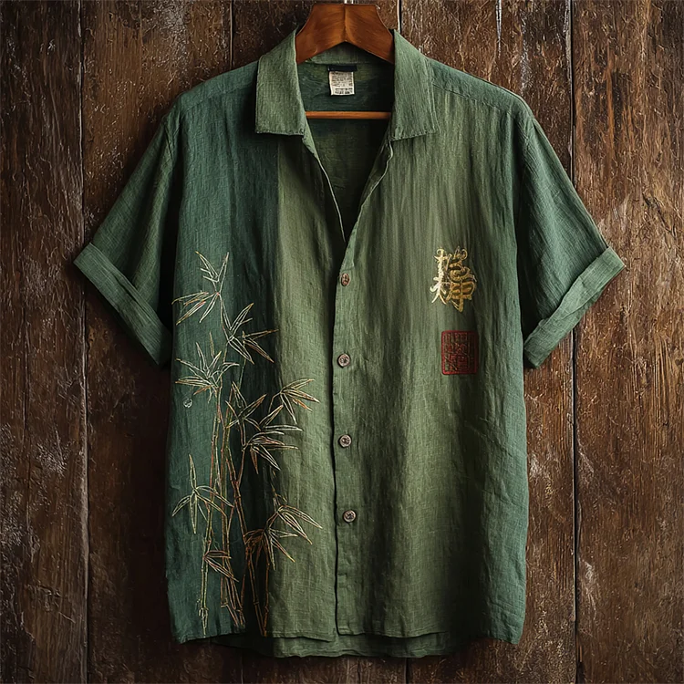 Japanese Bamboo Embroidered Colorblock Linen Shirt