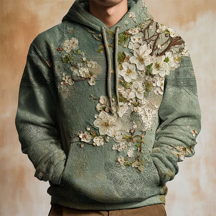 Japanese Embossed Floral Art Men's Hooded Sweatshirt