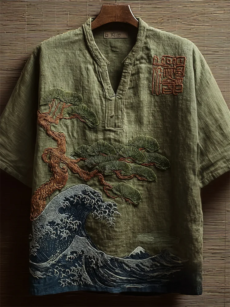 Japanese Pine Tree & Sea Waves Embroidered Linen Shirt