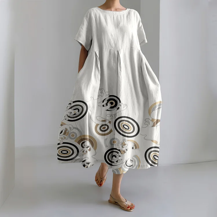 Japanese Wave Geometric Art Round Neck Short Sleeve Midi Dress
