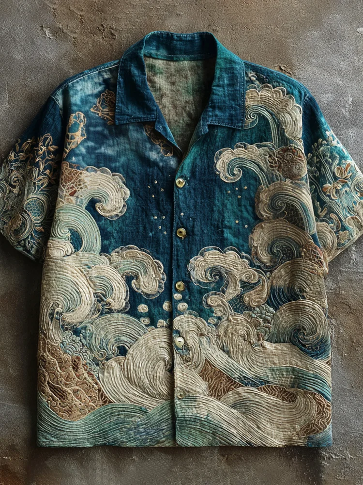 Japanese Wave Tie-dye Art Vintage Men's Linen Short Sleeve Shirt