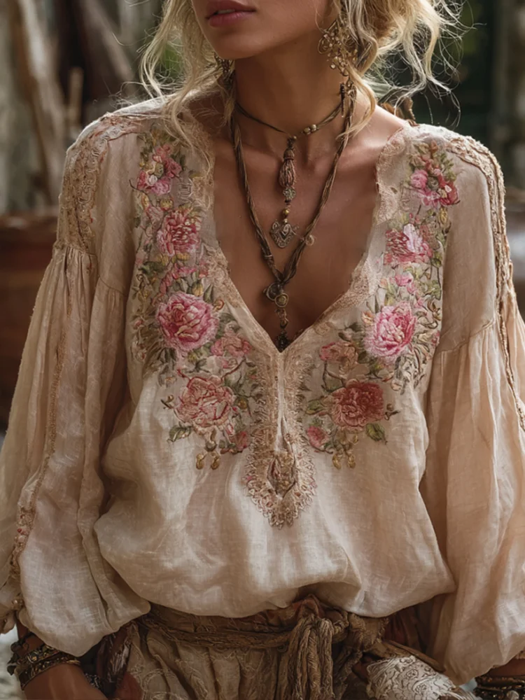 Ladies' Embroidered Pink Rose Long Sleeved V-neck Retro Top