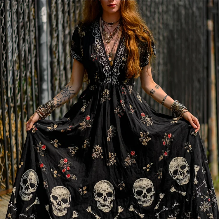 Ladies' Vintage V-neck Long Dress With Skull And Flower Print