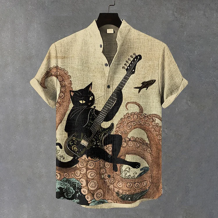 Men's Black Cat Guitarist And Octopus Print Short Sleeve Shirt