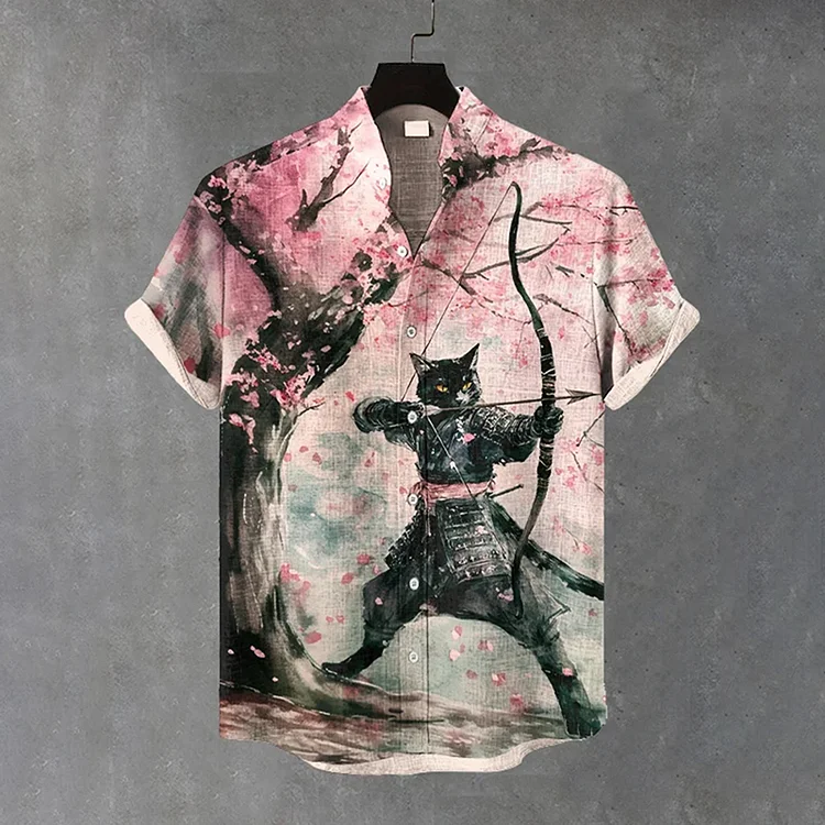 Men's Black Cat Practicing Archery Art Print Casual Shirt