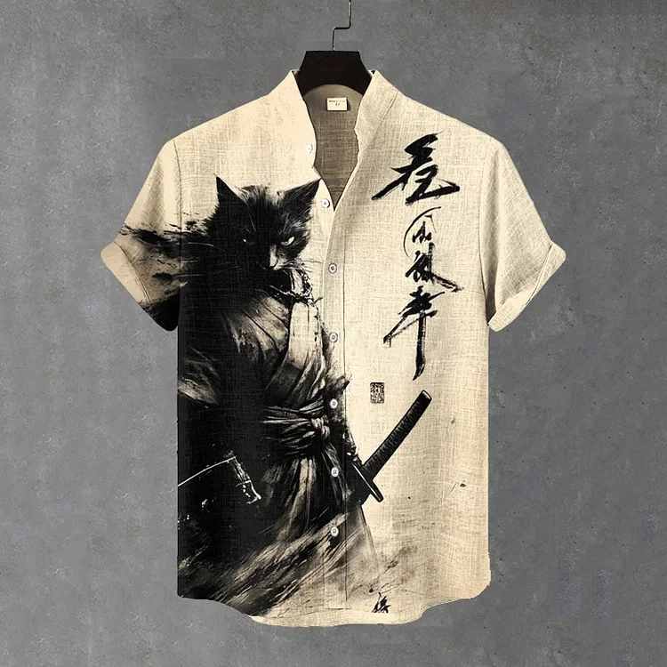Men's Black Cat Samurai Ink Painting Art Print Short Sleeve Shirt