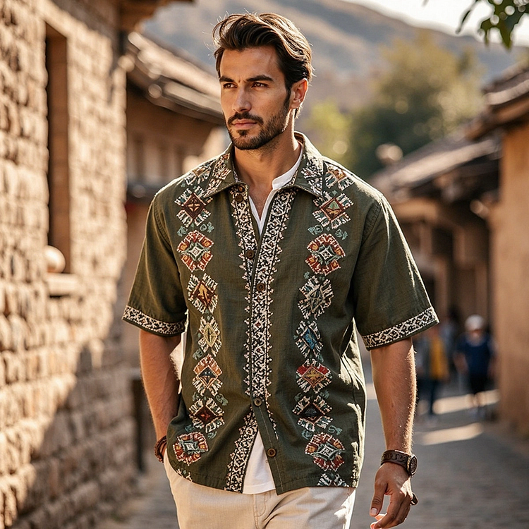 Men's Bohemian Tribal Embroidered Linen Short Sleeve Shirt