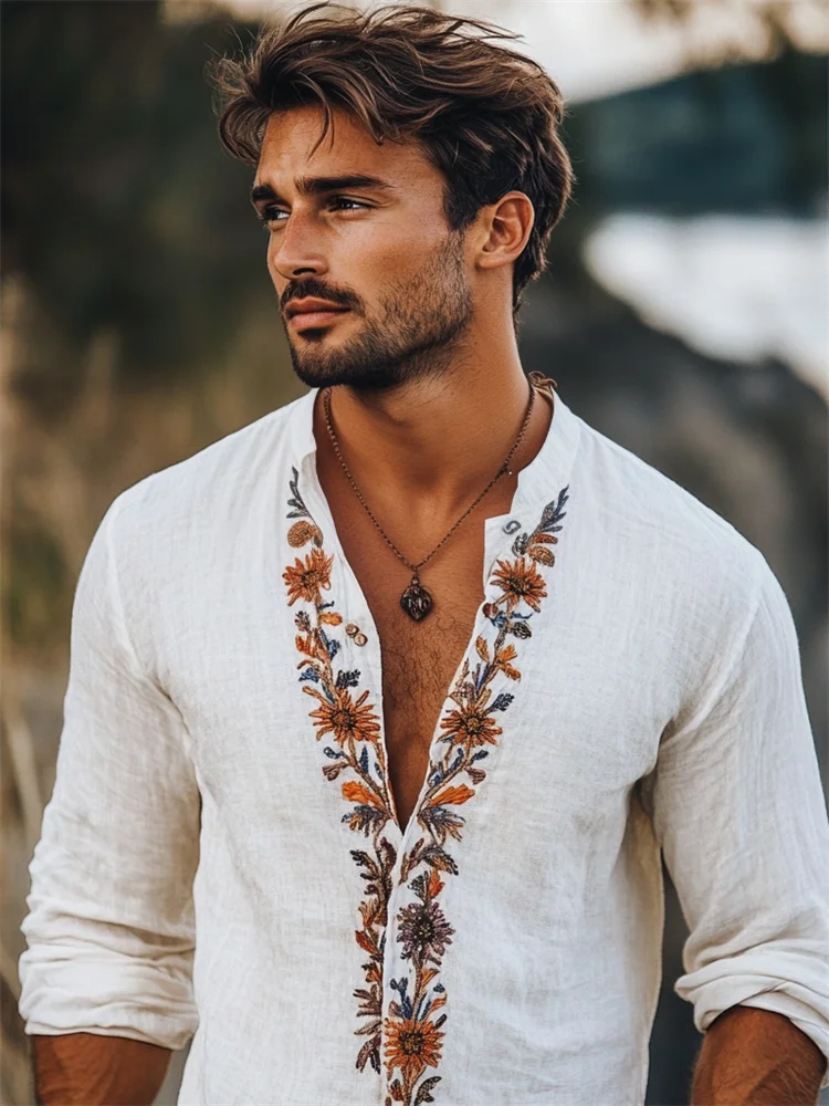 Men's Boho Floral Embroidered Placket Linen Shirt