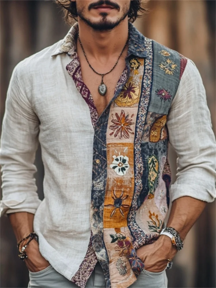 Men's Boho Hippie Colorblock Linen Blend Shirt