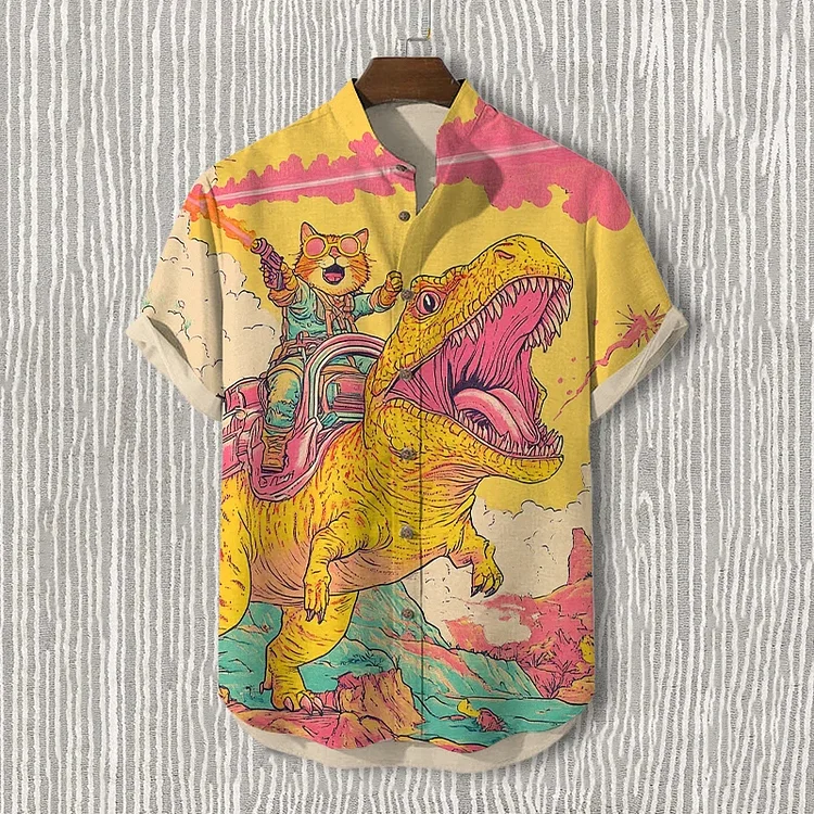 Men's Cat And Dinosaur Fantasy Art Print Casual Shirt