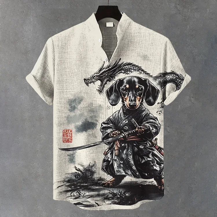 Men's Dachshund Samurai And Dragon Traditional Ink Art Print Short Sleeve Shirt