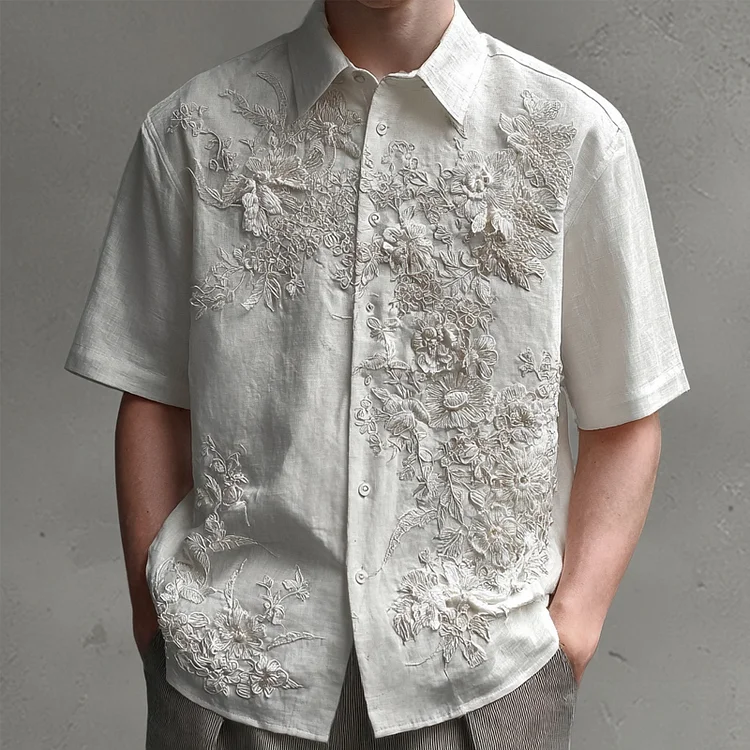 Men's Floral Lace Embroidered Vintage Linen Shirt