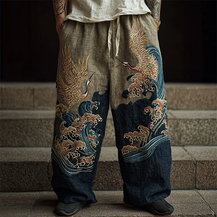 Men's Japanese Cranes Sea Waves Embroidered Linen Pants
