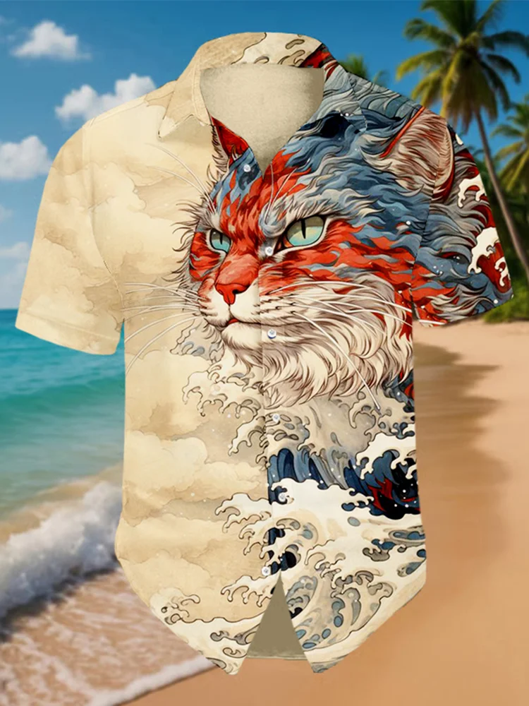 Men's Japanese Great Wave Inspired Mysterious Cat Art Beach Linen Shirt
