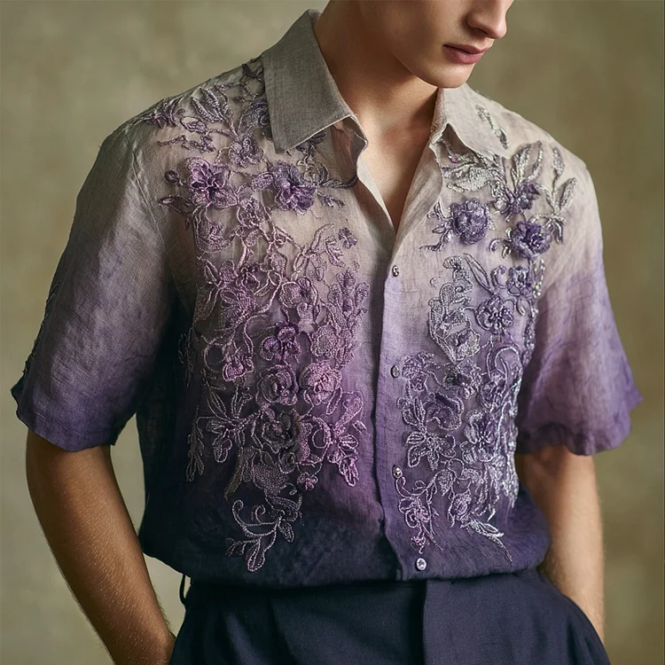 Men's Purple Floral Lace Embroidered Gradient Linen Shirt