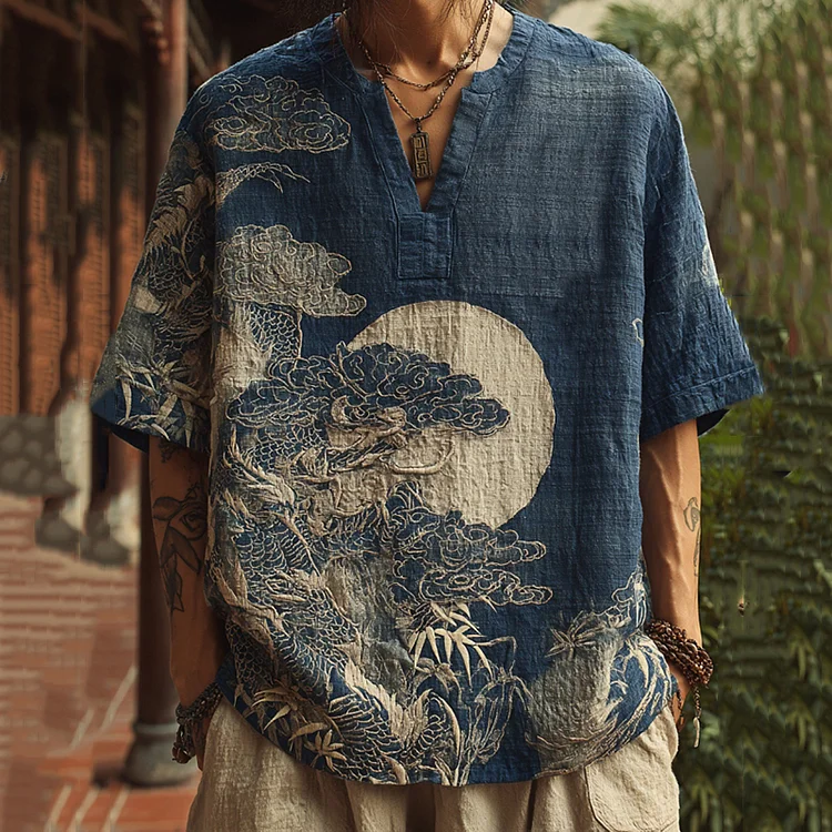 Men's Retro Landscape Embroidery Casual V Neck Short Sleeve Shirt