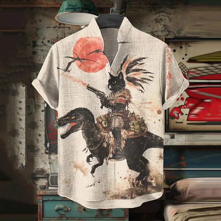 Men's Retro Tribal Black Cat Rides A Dinosaur Print Short Sleeve Shirt