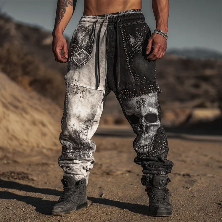 Men's Rock Style Skull Studded Contrast Patchwork Sweatpants