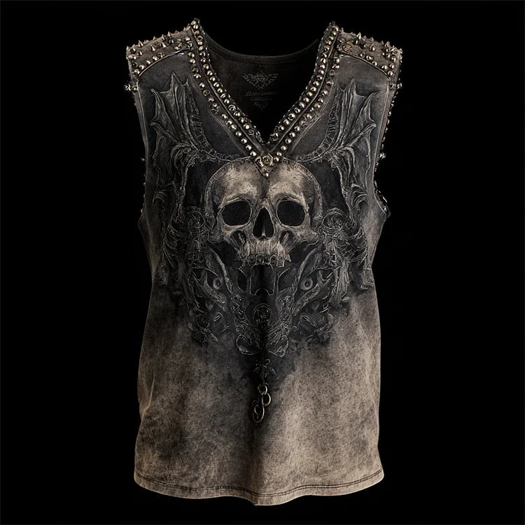 Men's Rock Style Skull With Bat Wings Studded Faded Tank Top