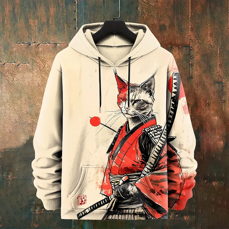 Men's Samurai Cat Japanese Art Graphics Print Casual Hoodie