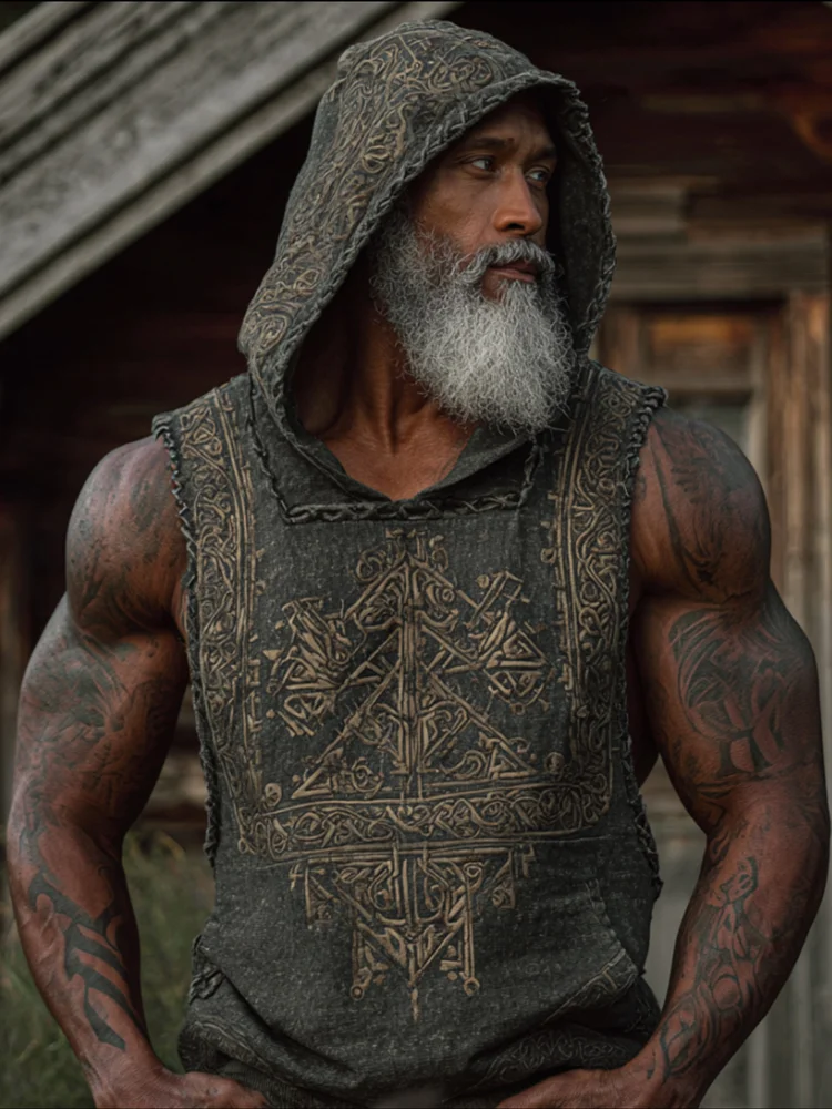Men's Viking-style Hot-stamped And Gold-plated Totem Embroidery Hooded Sleeveless Shirt
