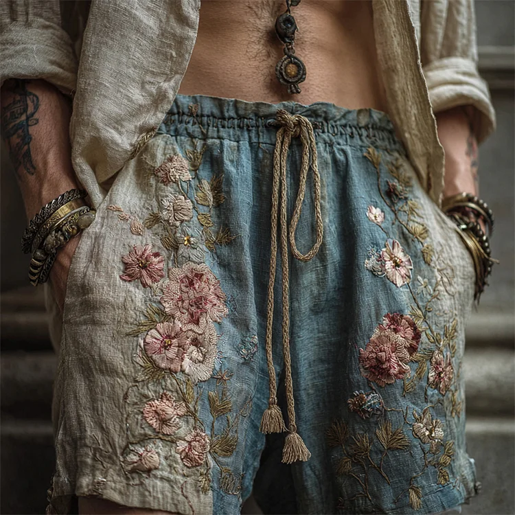 Men's Vintage Boho Floral Embroidered Contrast Linen Shorts