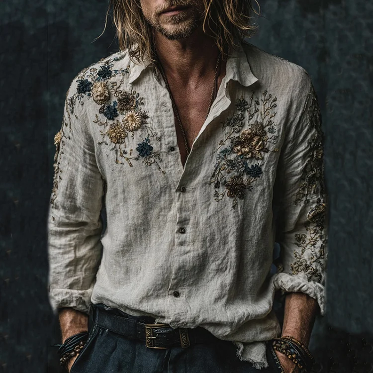 Men's Vintage Floral Embroidered Art Comfy Long Sleeve Shirt