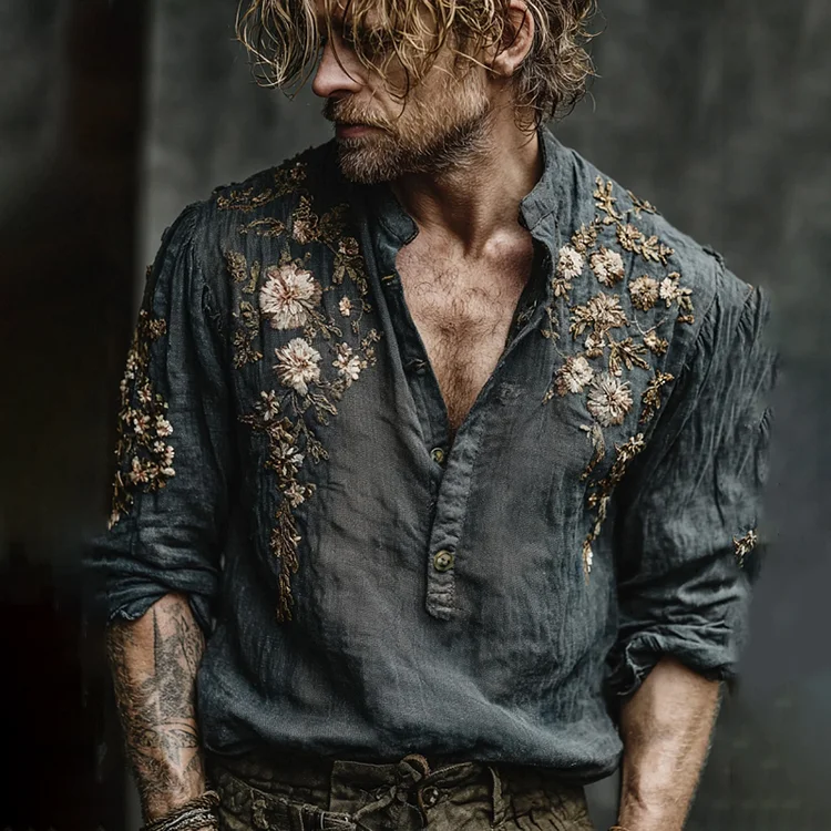 Men's Vintage Floral Embroidered Button Comfy Washed Linen Shirt