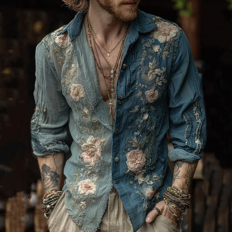 Men's Vintage Floral Embroidered Color Block Comfy Linen Shirt