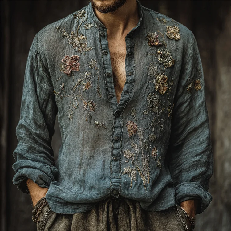 Men's Vintage Floral Embroidered Washed Linen Shirt