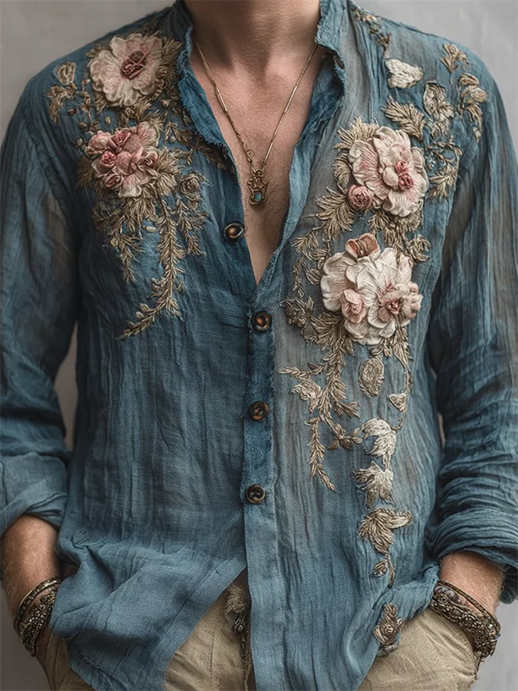 Men's Vintage Floral Fiber Art Embroidered Linen Shirt