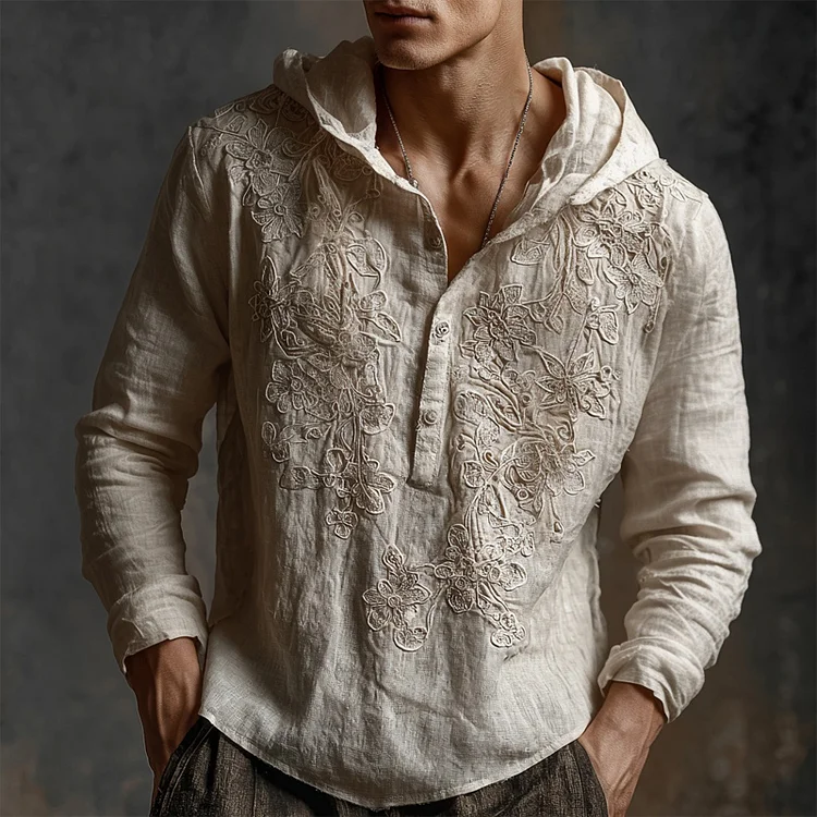 Men's Vintage Floral Lace Embroidered Hooded Linen Shirt