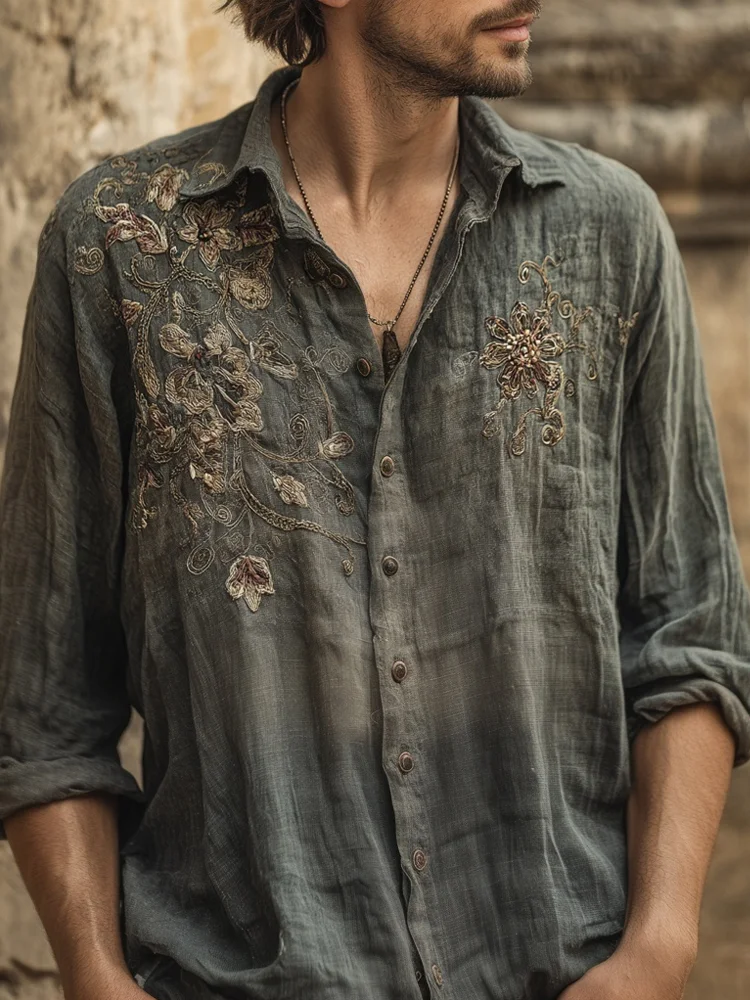 Men's Vintage Flowers Embroidered Breathable Linen Blouse