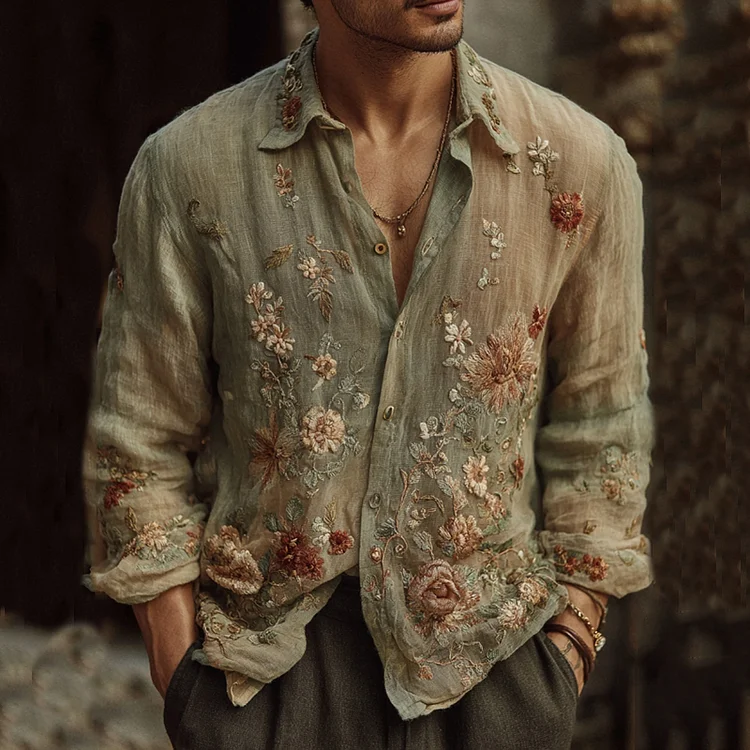 Men's Vintage Gradient Floral Embroidered Art Linen Shirt