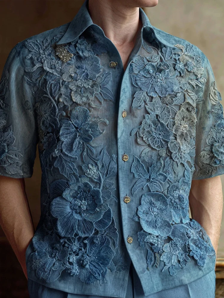 Men's Vintage Lace Flowers Embroidered Cozy Linen Shirt