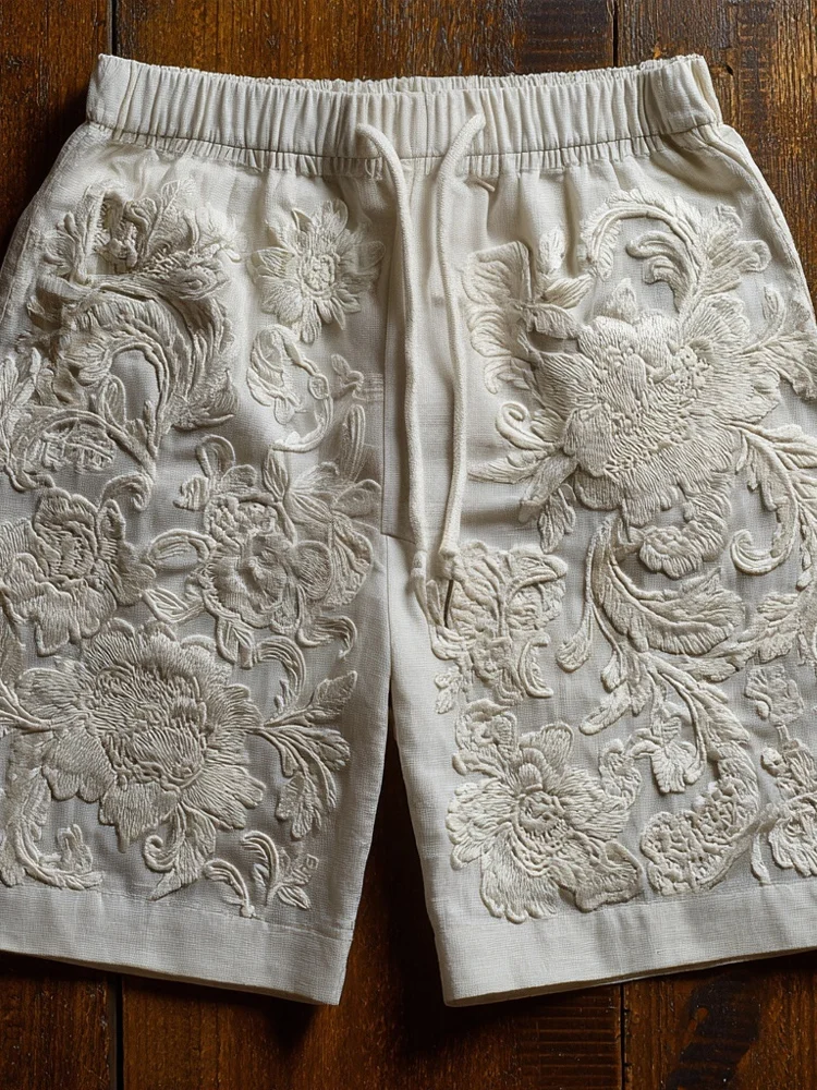 Men's Vintage Lace Flowers Embroidered Linen Shorts