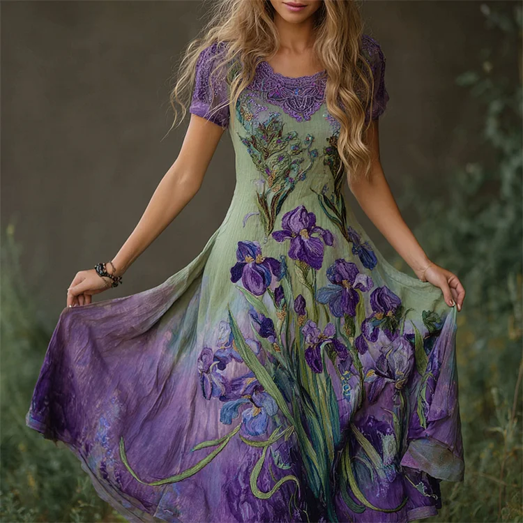 Oil Painting Purple Irises Embroidered Lace Patchwork Linen Maxi Dress