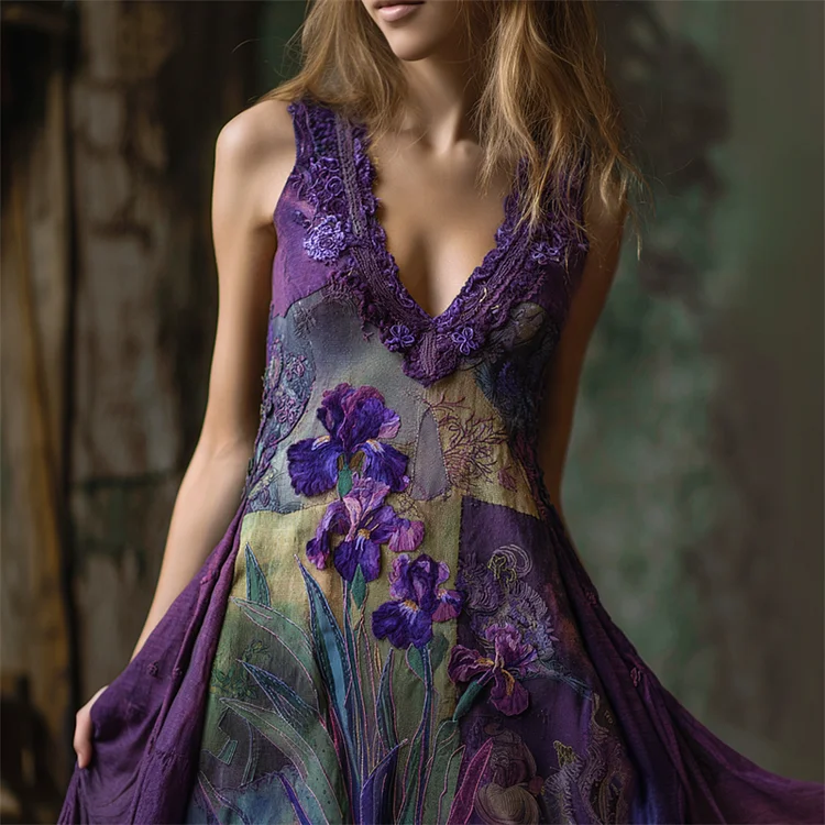 Purple Irises Fiber Art Embroidered Lace Patchwork Linen Dress