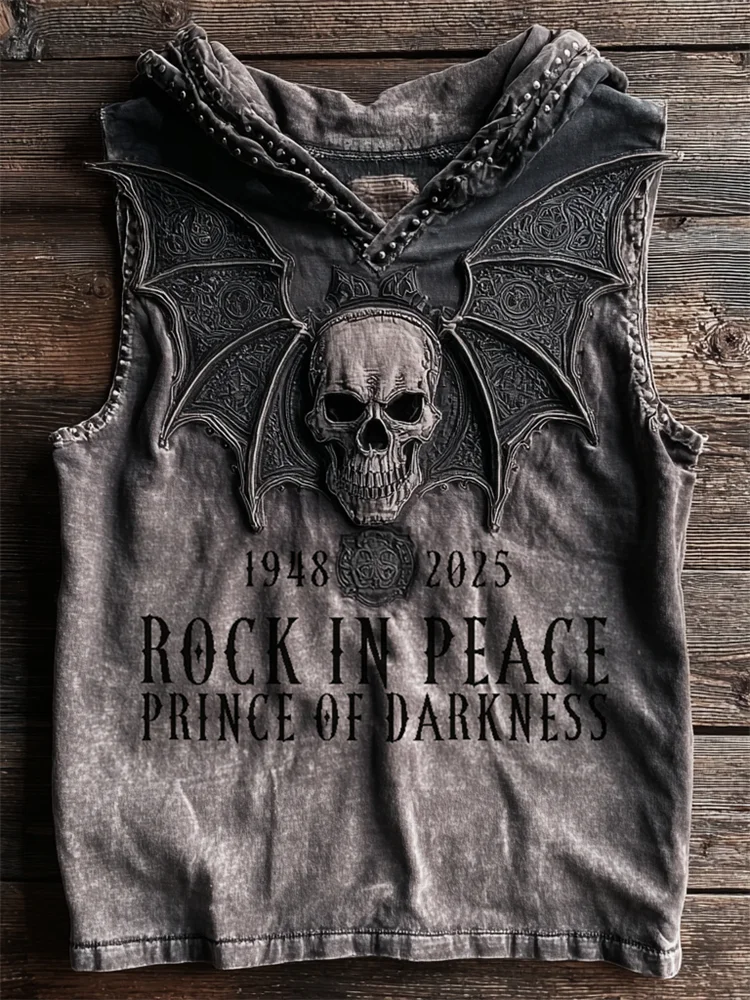 Rock In Peace Bat Wings Skull Studded Washed Hooded Tank Top