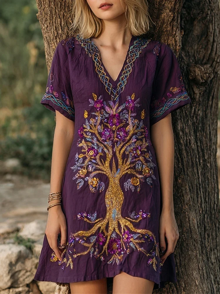 Sequined Tree Of Life Floral Embroidery Women's Linen Short Sleeve V-neck Mini Dress