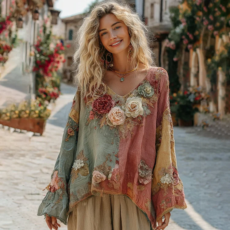 The Ice Cream Collection Women's Classic Bohemian Floral And Rose Gradient Linen Long Sleeve Shirt