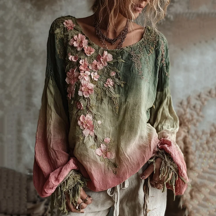 Vintage Cherry Blossom Gradient Linen Long Sleeve Shirt