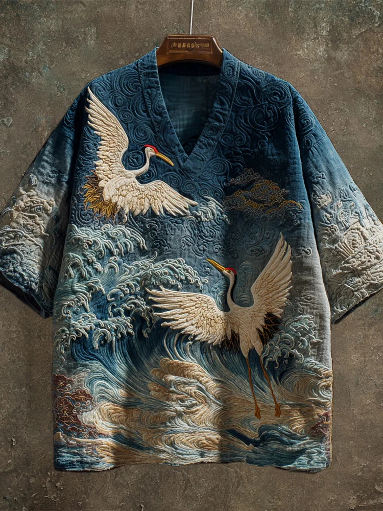 Vintage Japanese Crane Art Men's Linen V-neck Shirt
