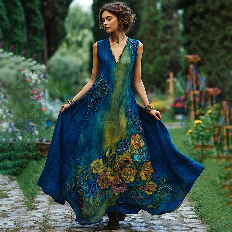 Vintage Oil Floral Embroidered Art Comfy Linen Maxi Dress